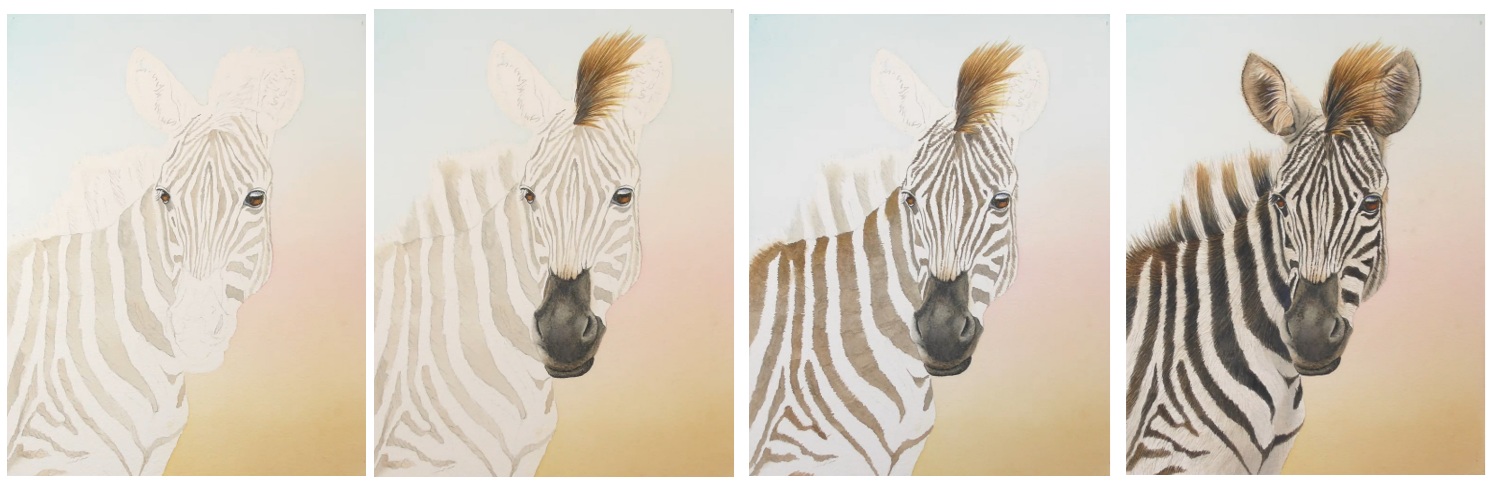 Learn how to paint this zebra in watercolor with an optional background. Use these techniques to paint your own similar subject!